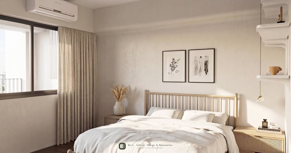 天花:弧線造型弱化樑的存在,讓視覺更柔和。軟裝:以軟裝為主軸,布料、木質與光線營造安定氛圍。牆面:中性色調為基底,搭配藝術畫作,延伸空間的靜謐感。光線:自然光與暖色照明交錯,帶出柔和的休息氛圍。